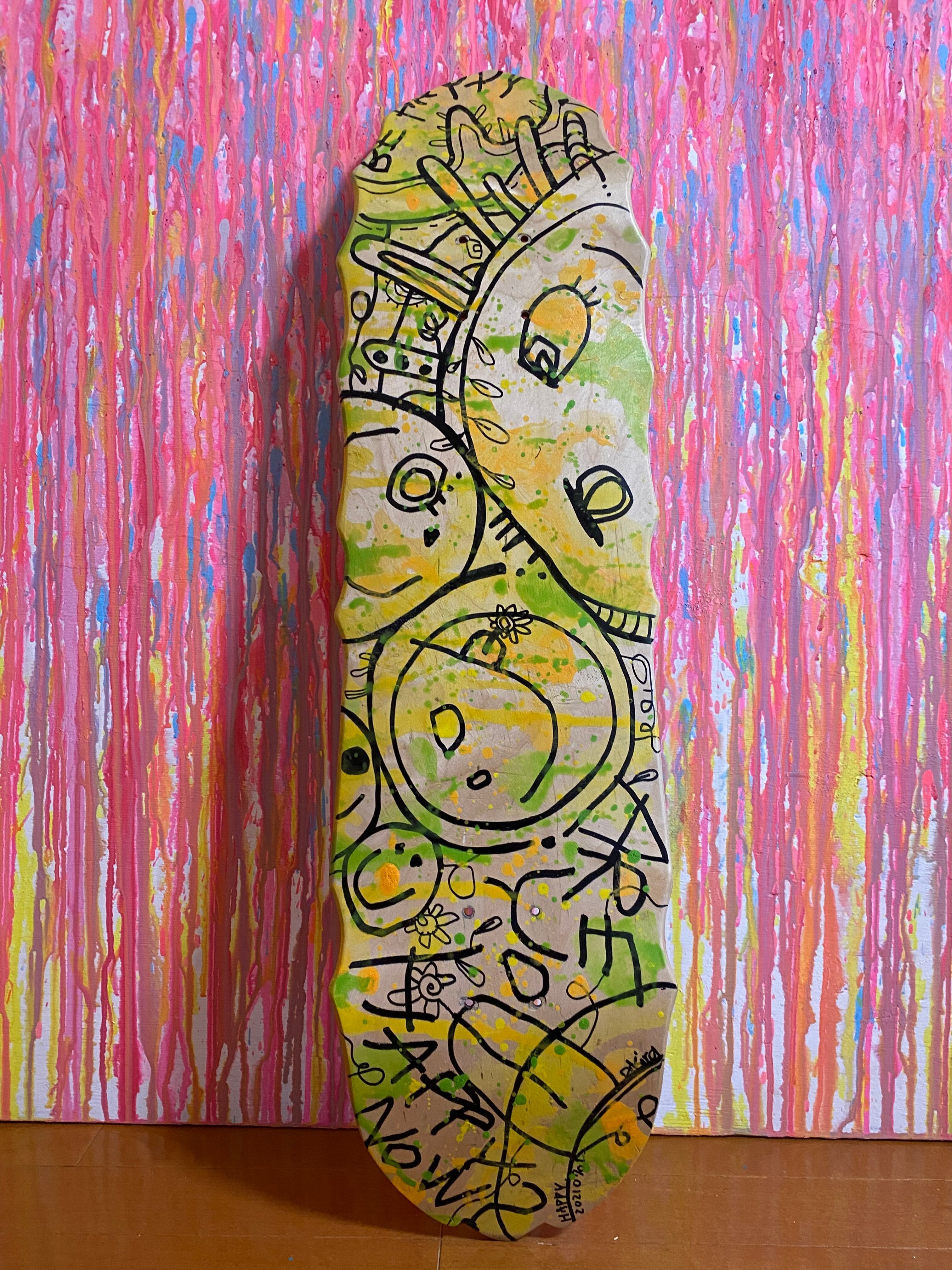 オールドの板をリサイクルしたのもをオリジナルのシェイプに削り出したボードのへ、Akiraがアートを施した作品です。